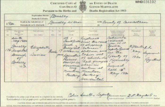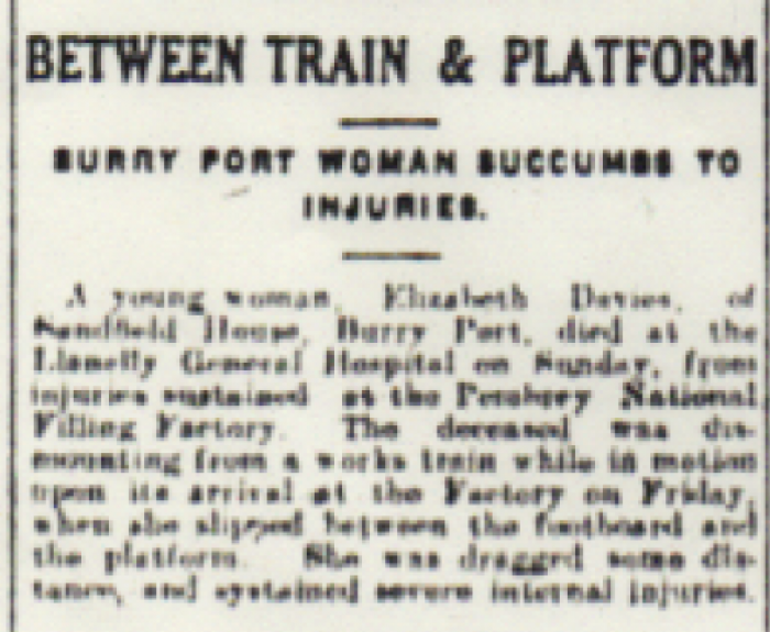 Notes: A young woman, Elizabeth Davies, of Sandfield House, Burry Port, died at Llanelly General Hospital on Sunday, from injuries sustained at the Pembrey National Filling Factory. The deceased was dismounting from a works train while in motion at its arrival at the Factory on Friday, when she slipped between the footboard and the platform. She was dragged some distance and sustained severe internal injuries. Llanelly and County Guardian 13th May 1920 Aged 17. 'A young woman, Elizabeth Davies, of Sandfield House, Burry Port, died at Llanelly General Hospital on Sunday, from injuries sustained at the Pembrey National Filling Factory. The deceased was dismounting from a works train while in motion at its arrival at the Factory on Friday, when she slipped between the footboard and the platform. She was dragged some distance and sustained severe internal injuries.' Llanelly and County Guardian 13th May 1920 A young woman, Elizabeth Davies, of Sandfield House, Burry Port, died at Llanelly General Hospital on Sunday, from injuries sustained at the Pembrey National Filling Factory. The deceased was dismounting from a works train while in motion at its arrival at the Factory on Friday, when she slipped between the footboard and the platform. She was dragged some distance and sustained severe internal injuries. Llanelly and County Guardian 13th May 1920